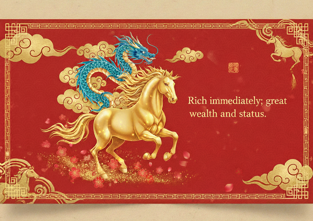 - 馬年大旺,財源廣進。 — Thrive in the Horse Year and wealth spreads wide.